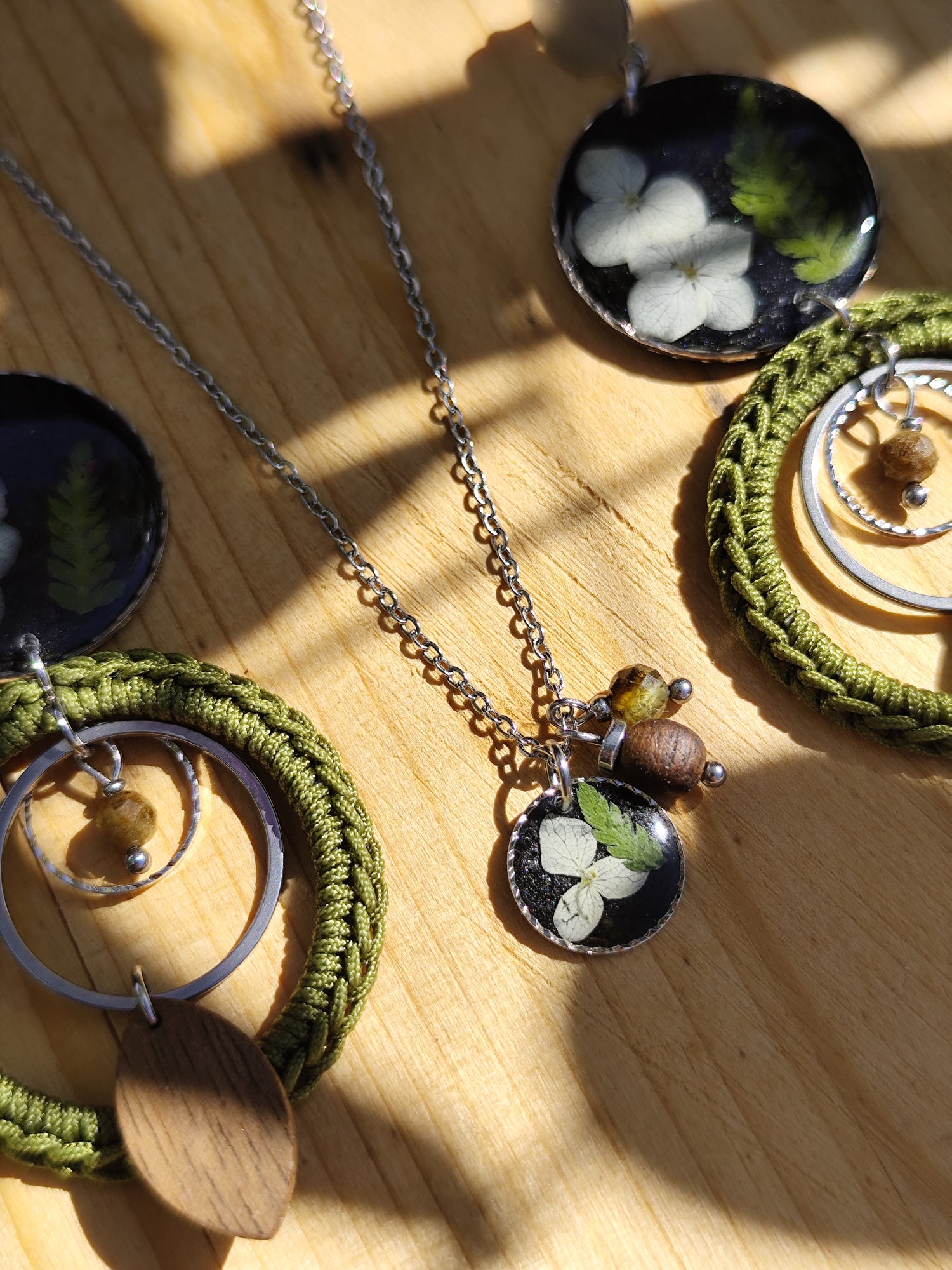 ‚Waldlicht‘ vereint echte Hortensien und Farn auf schwarzem Hintergrund mit Granat und warmem Nussholz. Eigene, sorgfältig ausgewählte Blüten treffen auf regionale Materialien – jede Form handgefertigt und inspiriert von der Tiefe des Waldes.