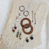 zwei Kreolen, zwei Nussholz-Ringe, zwei Nussholz-Perlen, zwei Anhänger mit Dalmatiner-Jaspis, zwei feine Kettenanhänger, zwei Süßwasserzuchtperlen-Anhänger sowie zwei eckige Lavasteine.
